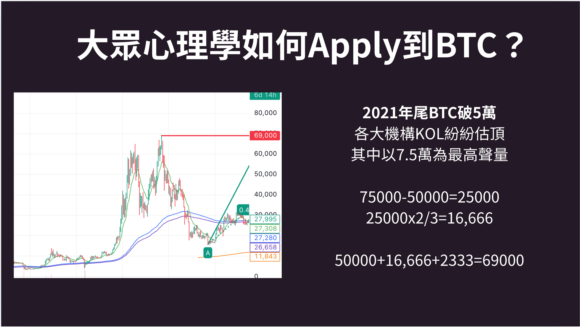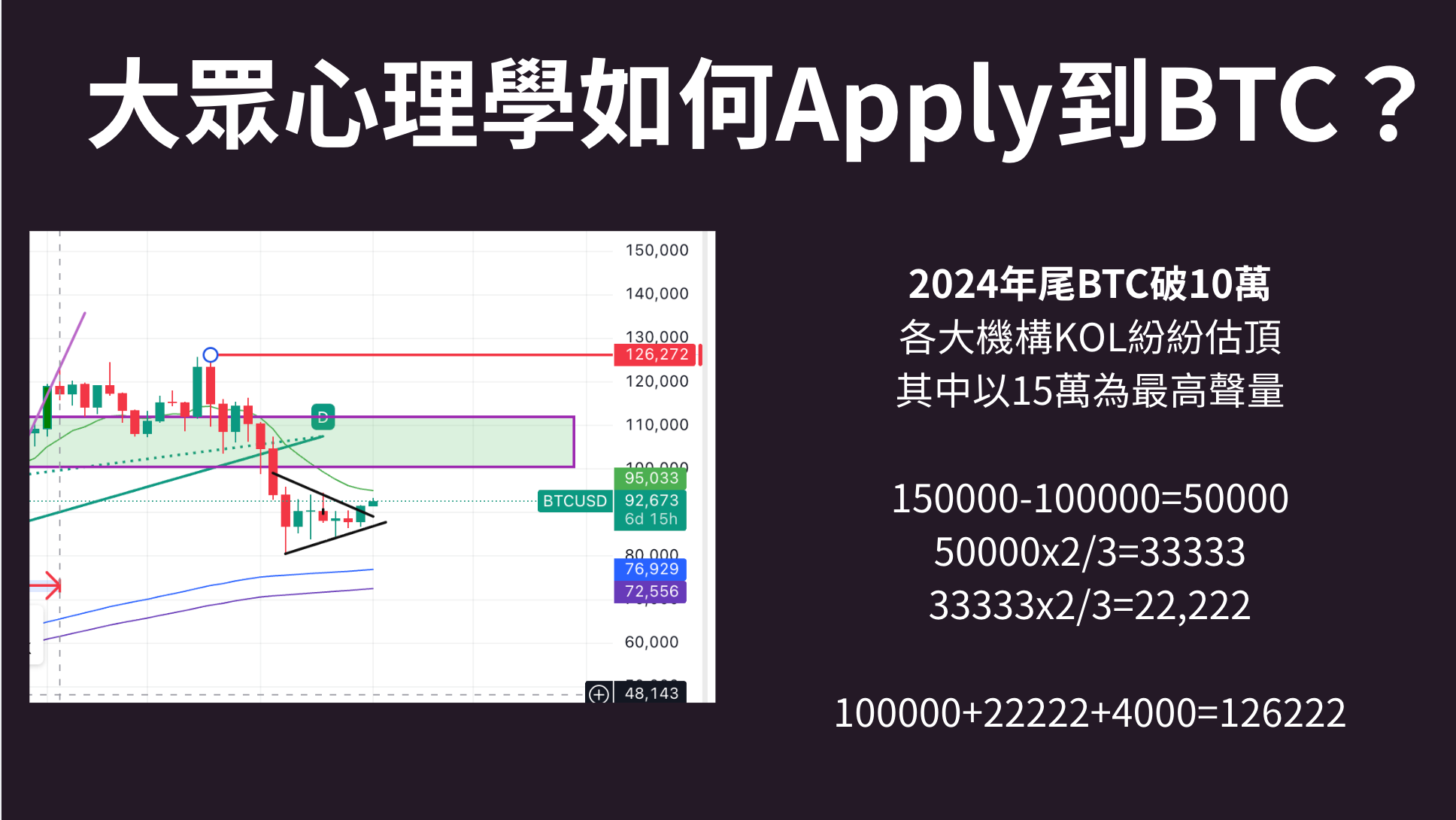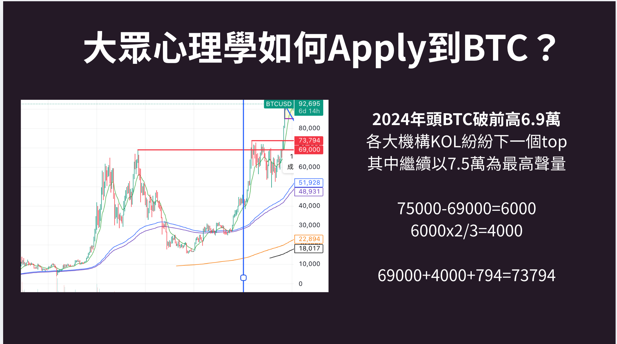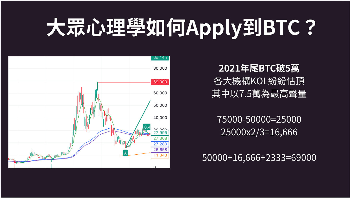 第一層是33,第二層是22,第三層是14.6,反映在場人士的理性層次在第二和第三層之間。我們再看看以往幾次大眾心理學如何Apply到BTC?(圖為當時的簡報)